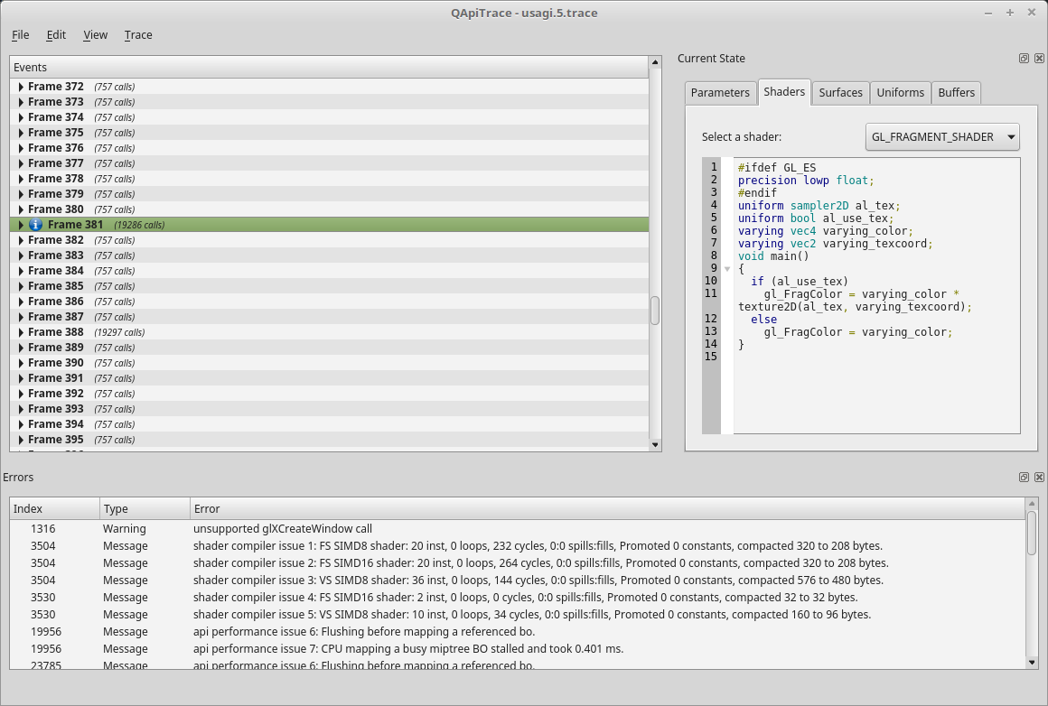 What's noticeable though, is that there are a few frames with crazy high numbers of OpenGL calls. 19286 calls in one frame? Now that would certainly cause a jitter! Apitrace lets you examine these calls in detail, as in the screenshot below.