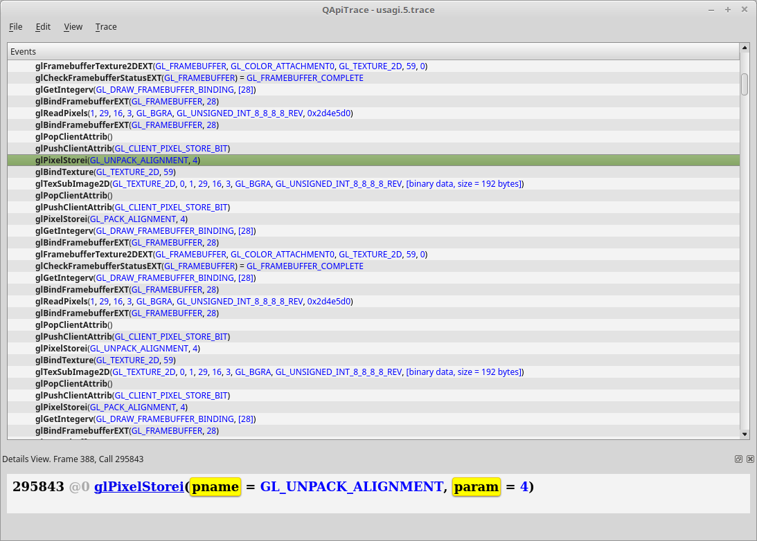So I open Usagi in the GNU debugger (gdb) and start tracking back from glPixelStorei